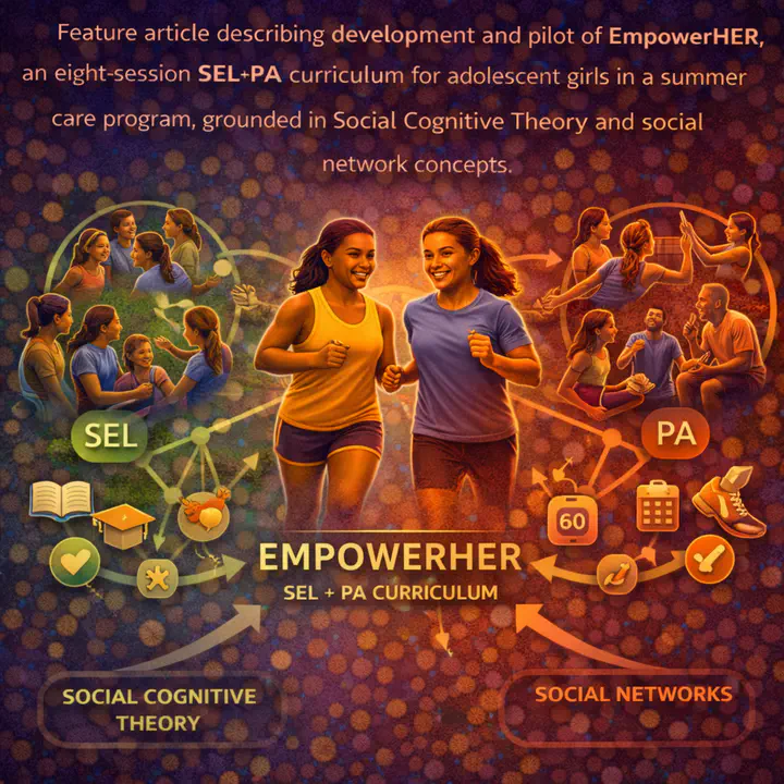 Feature article describing development and pilot of EmpowerHER, an eight-session SEL+PA curriculum for adolescent girls in a summer care program, grounded in Social Cognitive Theory and social network concepts.