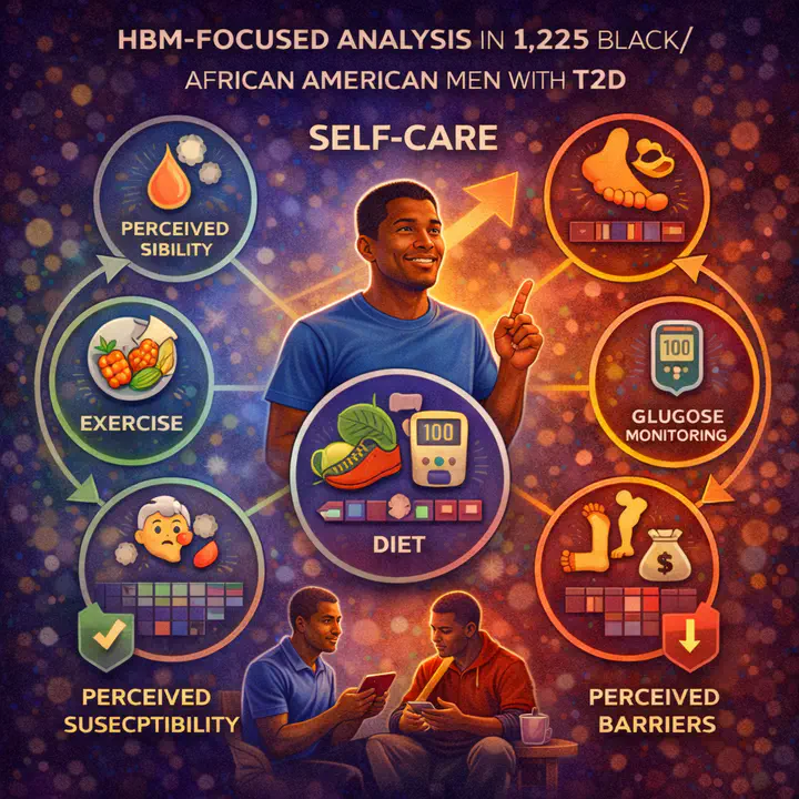 HBM-focused analysis in 1,225 Black/African American men with T2D: self-efficacy robustly predicts self-care across diet, exercise, glucose monitoring, and foot care; perceived susceptibility and severity show positive associations with several domains; perceived barriers relate negatively; perceived benefits largely nonsignificant.