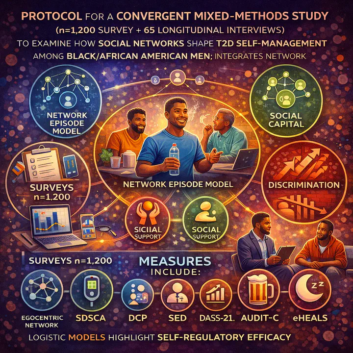 Protocol for a convergent mixed-methods study (n=1,200 survey + 65 longitudinal interviews) to examine how social networks shape T2D self-management among Black/African American men; integrates Network Episode Model, Social Support, Social Capital, and discrimination frameworks; measures include egocentric network composition, interaction, SDSCA, DCP, SED, DASS-21, AUDIT-C, eHEALS, and EDS.