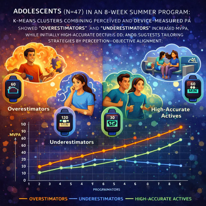 Adolescents (n=47) in an 8-week summer program: k-means clusters combining perceived and device-measured PA showed “Overestimators” and “Underestimators” increased MVPA, while initially high-accurate actives declined; suggests tailoring strategies by perception–objective alignment.