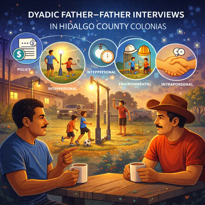 Dyadic father–father interviews (n=30; 15 dyads) in Hidalgo County colonias identified policy, environmental, interpersonal, and intrapersonal influences on father/child PA. Fathers described resilience strategies (e.g., installing lights for night play, building makeshift equipment) and emphasized cultural meaning of PA, community support, and occupational/time barriers.